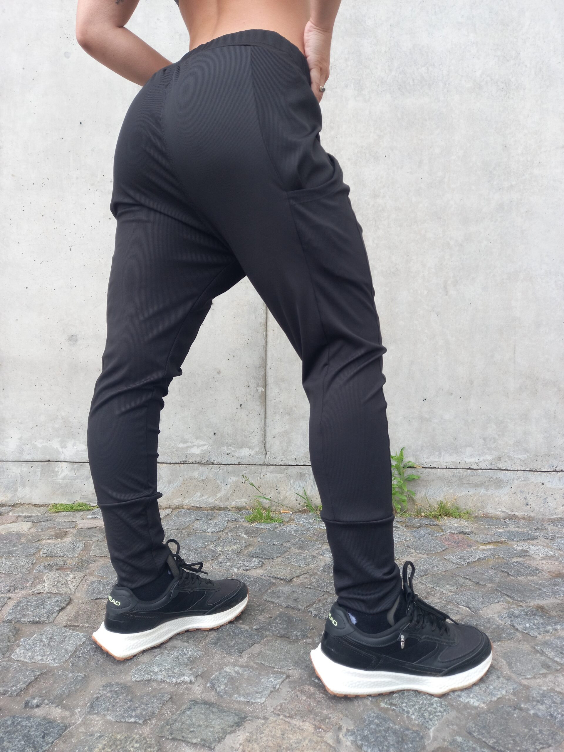 Pantalón babucha ajustable en cintura, con bolsillos y puño. Confeccionada en microfibra con lycra morley.