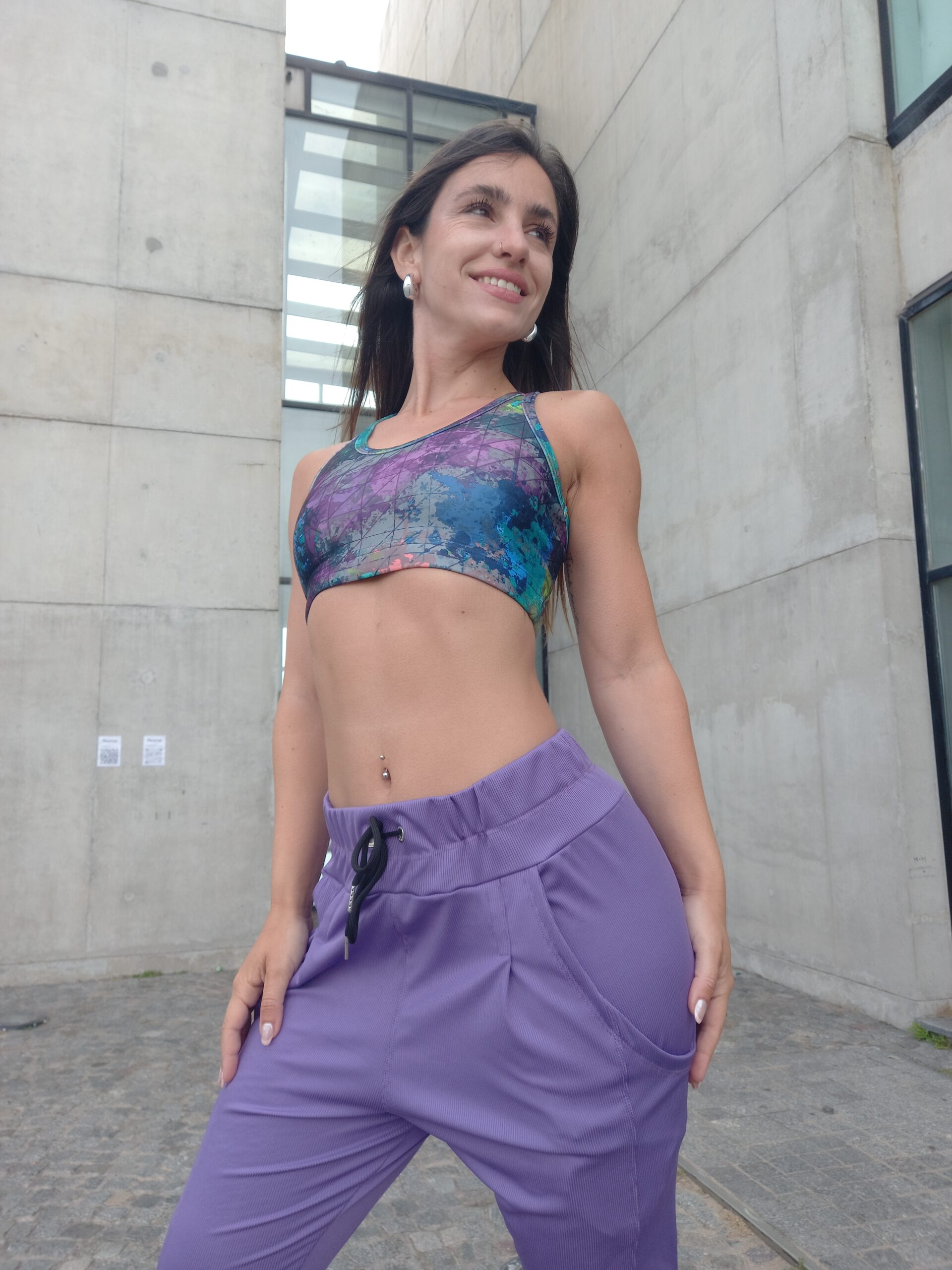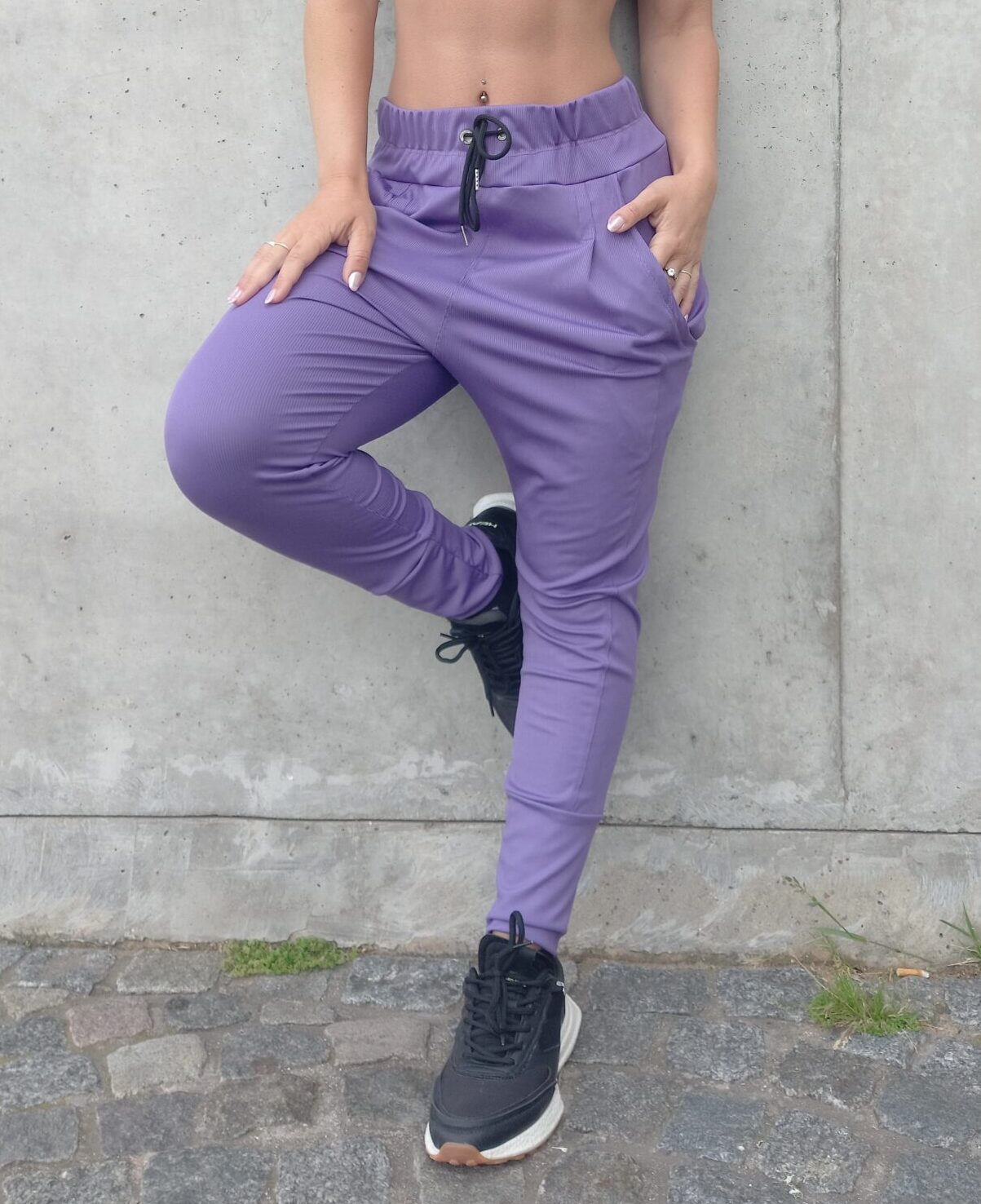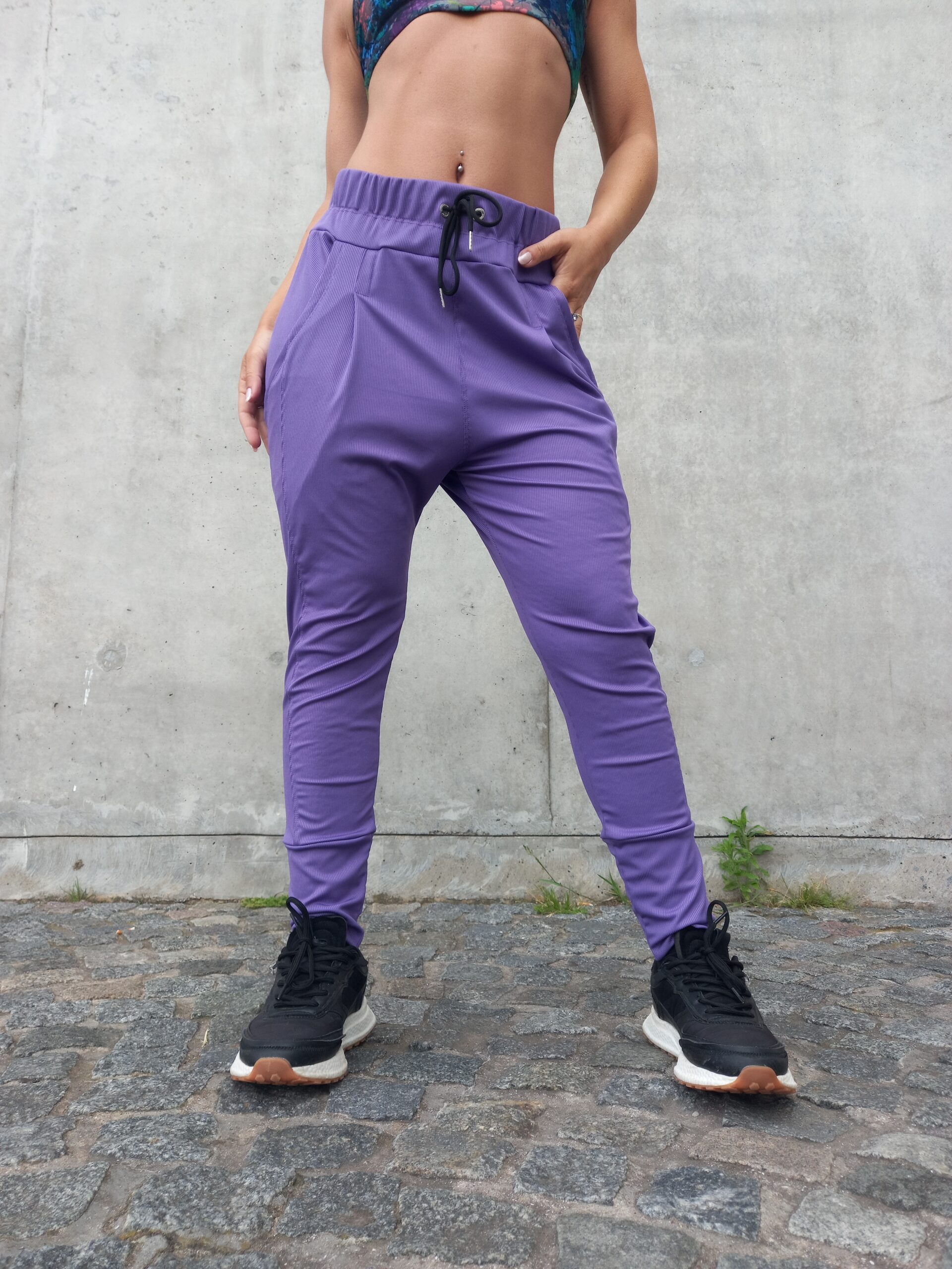 Pantalón babucha ajustable en cintura, con bolsillos y puño. Confeccionada en microfibra con lycra morley.