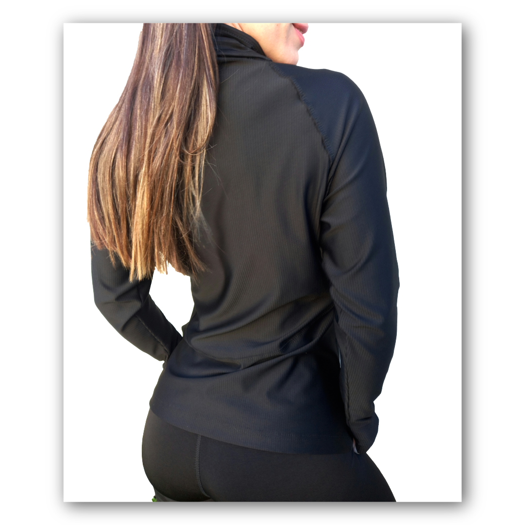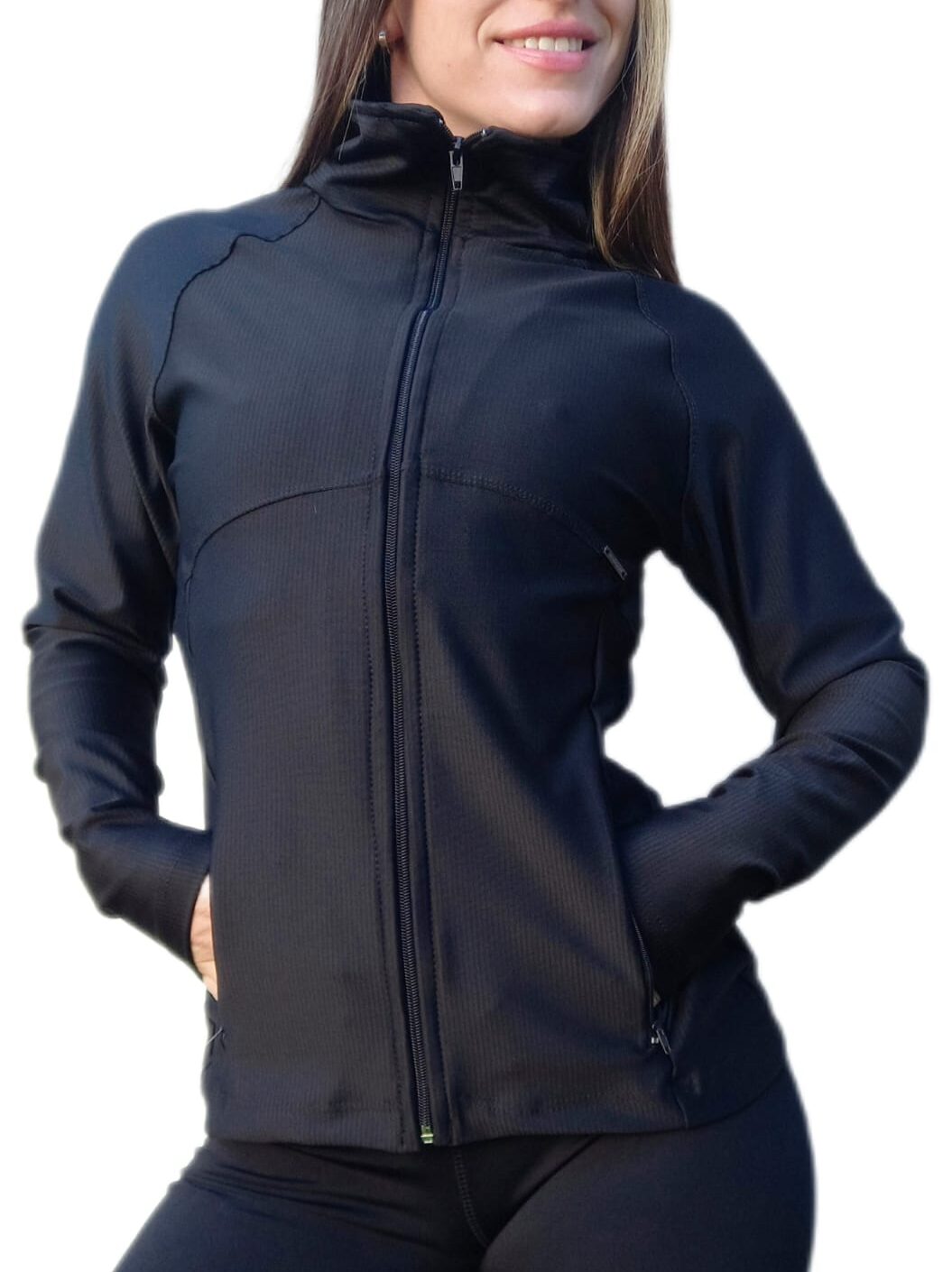 Confeccionada en microfibra con lycra premium tejido Morley. Modelo anatómico, cuello alto y bolsillos con cierre.